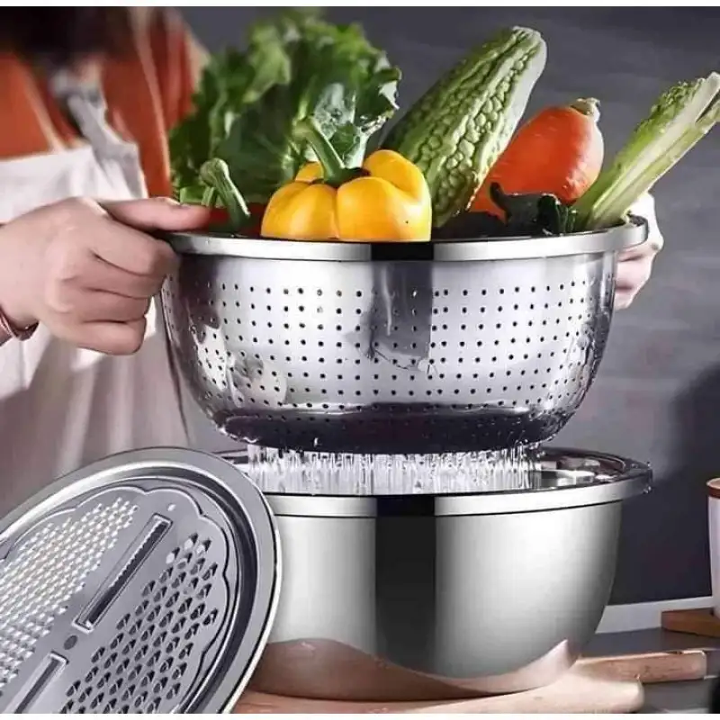 3in1 Vegetable Cutter Set হলো একটি স্মার্ট কিচেন টুল যা দিয়ে সবজি ধোয়া, পানি ঝরানো ও গ্রেট করে কাটা—সব কাজ এক সেটেই করা যায়।